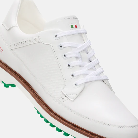 Der DaVinci von Duca del Cosma kombiniert klassische italienische Handwerkskunst mit zeitloser Eleganz: Das Obermaterial besteht aus geprägt-em Vollnarbenleder („full-grain“) in Premiumqualität und wird durch ein onDura®-Futter verstärkt, das hohe Abriebfestigkeit und Langlebigkeit gewährleistet. Trotz seines edlen Looks ist der Schuh spikeless und bietet somit vielseitige Einsatzmöglichkeiten – auf dem Platz wie im Clubhaus. Das Modell überzeugt durch hohen Tragekomfort und durchdachte Technik: Die Sohle liefert stabilen Halt und Drehmomentkontrolle, das Innenleben sorgt auch an langen Golfrunden für angenehmes Laufgefühl. Mit seinem stilvollen Design, erstklassigen Materialien und solider Performance richtet sich der DaVinci an Golfer, die Wert auf Qualität, Komfort und Stil legen und gleichzeitig nicht auf Funktionalität verzichten wollen.