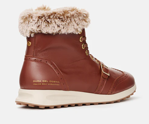 Der „Sabrina Cognac“ ist ein stilvoller Damen-Wintergolfschuh — gefertigt aus hochwertigem italienischem Nappa-Leder und handgearbeitet für besonders feine Verarbeitung. Er überzeugt durch wasserdichte Eigenschaften und ein atmungsaktives Bootie-System, sodass deine Füße auch bei Regen oder feuchtem Boden warm und trocken bleiben. Auffällig ist das elegante Design: Eine markante Schnalle kombiniert mit einem Kunstpelzkragen verleiht dem Schuh einen modischen Winterlook — nicht nur auf dem Golfplatz, sondern durchaus auch im Alltag tragbar. Innen sorgt ein weiches Fleecefutter für Komfort und Wärme, was lange Golfrunden oder Spaziergänge im Herbst und Winter deutlich angenehmer macht. Gleichzeitig bleibt der Schuh funktional — mit einer spikeless Sohle, die guten Halt bietet, ohne klassisch golf-typische Spikes nach außen tragen zu müssen. Kurz gesagt: Der Sabrina Cognac vereint italienische Handwerkskunst, warmen Komfort und modisches Design — perfekt für Golferinnen, die auch bei kühlem Wetter stilvoll auftreten wollen.