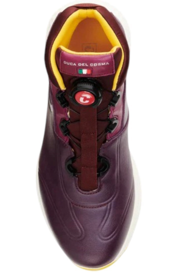 Der Duca del Cosma Toscana in der Farbvariante „Bordeaux“ verbindet italienisches Handwerk mit modernem Golfkomfort. Gefertigt aus weichem Nappaleder in Italien und kombiniert mit hochwertigen Mikrofaser-Elementen bietet dieser Schuh nicht nur stilvolle Eleganz, sondern auch fachmännische Funktion. Dank des OnSteam® Sockensystems bleibt Ihr Fuß bei nassen Bedingungen trocken, während die Airplay XII-Außensohle aus recycelbarem Eco-Gummi mit vielseitiger Traktion sicheren Stand auf dem Grün ermöglicht. Abgerundet wird das Design durch eine ARNEFLEX® Memory-Foam-Einlegesohle und einen komfortablen Schuhabschluss – der Toscana Bordeaux ist damit der perfekte Begleiter für anspruchsvolle Golferinnen, die Stil und Performance gleichermaßen erwarten.