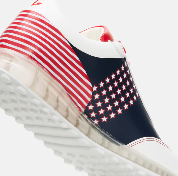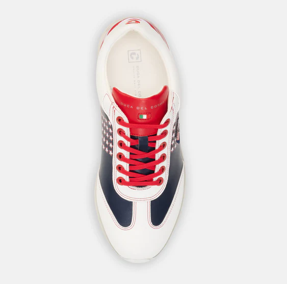 Der Duca del Cosma Unity vereint italienisches Design mit dynamischer Funktion: Gefertigt aus weichem Nappaleder zeigt er ein markantes Stars-&-Stripes-Motiv in Rot, Weiß und Blau – ein Statement für Stil und Patriotismus. Das wasserdichte Obermaterial hält bei feuchtem Wetter trocken, während die herausnehmbare ARNEFLEX®-Memory-Foam-Einlegesohle mit recyceltem Kork für Komfort sorgt. Die robuste Airplay IX-Außensohle mit 5-mm-Kegeln und leicht erhöhtem Absatz bietet stabilen Halt und optimale Standfestigkeit im Schwung. Zwei Sets farbiger Polyestersenkel (rot & weiß) ermöglichen individuelle Akzente – der Unity ist damit gleichermaßen ideal auf dem Platz wie abseits davon.