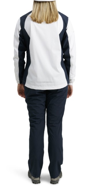 Ein durchgehender Frontreißverschluss, verstellbare Ärmelbündchen und praktische Taschen machen die Jacke besonders komfortabel. Das feminine, sportliche Design macht sie zudem vielseitig einsetzbar – sowohl auf dem Golfplatz als auch im Alltag.