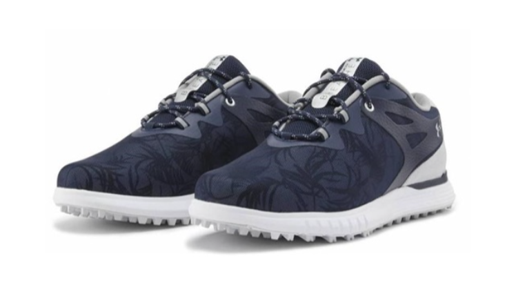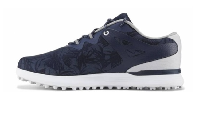 Das dezente Palmenmuster auf dem dunkelblauen Upper verleiht dem Schuh eine stylische, feminine Note – perfekt, wenn du sportlich-elegant auf dem Golfplatz auftreten möchtest.